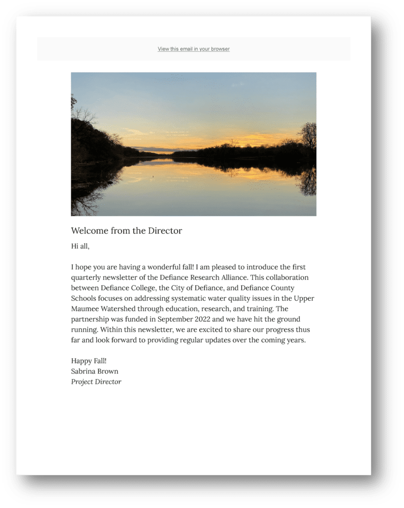 The Defiance Research Alliance (DRA) is a collaboration between Defiance College, the City of Defiance, and Defiance County Schools. DRA focuses on addressing systematic water quality issues in the Upper Maumee Watershed through education, research, and training.